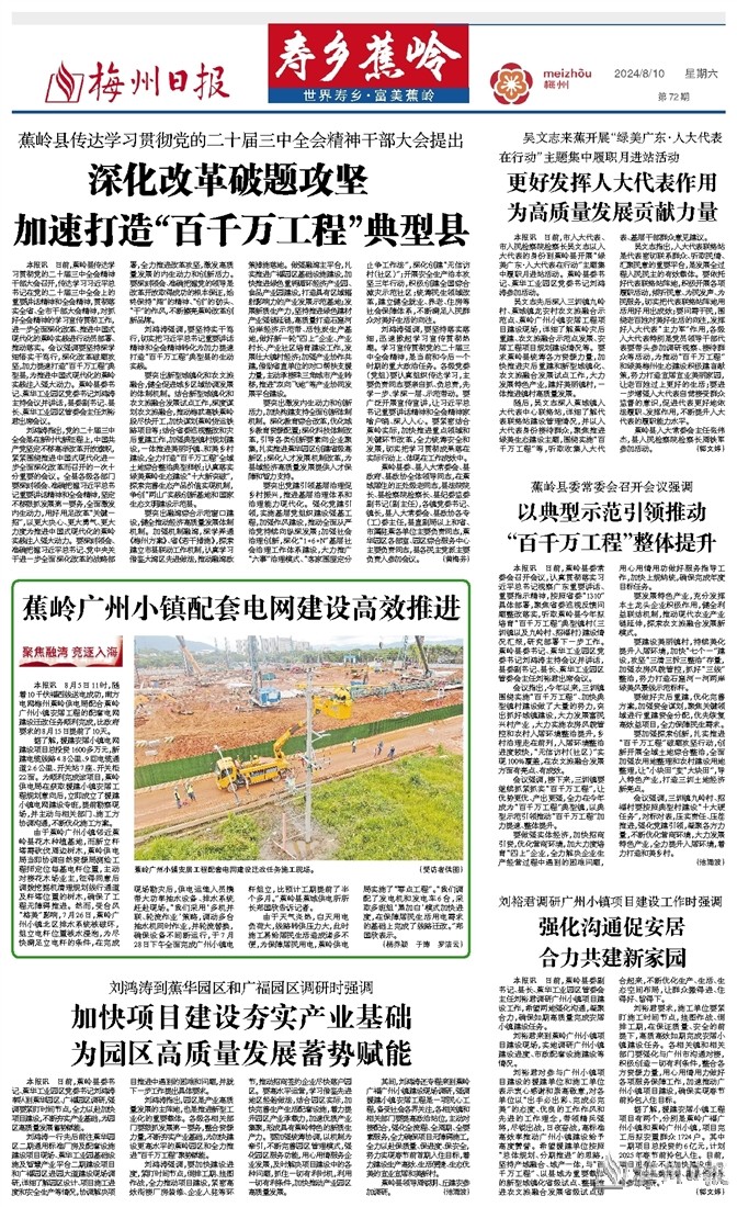 本报讯 日前,蕉岭县委常委会召开会议,认真贯彻落实习近平总书记视察广东重要讲话、重要指示精神,按照省委“1310”具体部署,聚焦省委巡视反馈问题整改落实,听取蕉岭县今年拟培育“百千万工程”典型镇村(三圳镇以及九岭村、招福村)建设情况汇报,研究部署下一步工作。蕉岭县委书记、蕉华工业园区党委书记刘鸿涛主持会议并讲话,县委副书记、县长、蕉华工业园区管委会主任刘裕君出席会议。