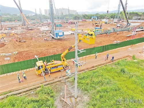 由于蕉岭广州小镇邻近蕉岭县花木种植基地,而新立杆塔需砍伐周边树木,蕉岭供电局当即协调自然资源局测绘工程师定位每基电杆位置,主动对接花木场业主,征得同意后调拨挖掘机清理规划线行通道及杆塔位置的树木,确保了工程无障碍推进。然而,受台风“格美”影响,7月26日,蕉岭广州小镇北区排水系统被破坏,组立电杆位置被水浸泡,为尽快满足立电杆的条件,在完成现场勘灾后,供电运维人员携带大功率抽水设备、排水系统赶赴现场。“我们采用‘多机并联、轮流作业’策略,调动多台抽水机同时作业,并轮流替换,确保设备不间断运行,于7月28日下午全面完成广州小镇电杆组立,比预计工期提前了半个多月。”蕉岭县蕉城供电所所长郑国欣告诉记者。
