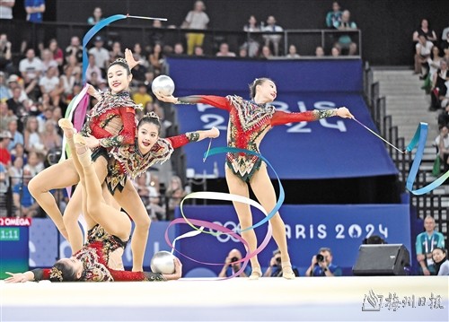 8月10日,中国队在比赛中。当日,在巴黎奥运会艺术体操项目集体全能决赛中,中国队获得冠军。