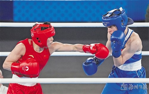 8月9日,吴愉(左)与恰克尔奥卢在比赛中。当日,在巴黎奥运会拳击项目女子50公斤级决赛中,中国选手吴愉战胜土耳其选手恰克尔奥卢,获得冠军。