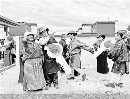 8月10日,在色达县色柯镇约若新村,牧民们在看新房。