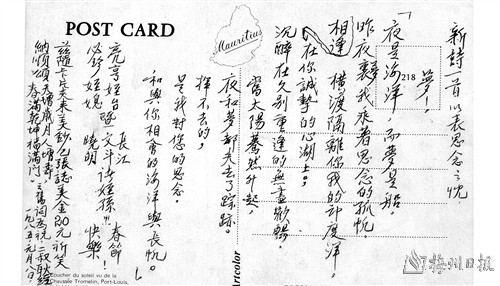 写到这里,再看手头一张明信片,我又看出他心有不甘,他知道自己有才华!这才华在“番邦”全无用处,其实是大陆所稀缺的。这是1983 年 3 月 3 日写下的,他说“七二生辰微醺,一抒无聊”。文字并未分行,虽是饮酒后的即兴,也有韵脚,散文让他写出诗味来: