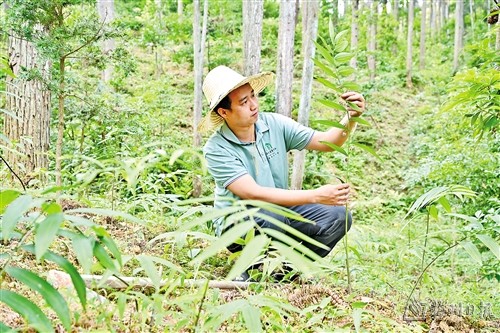 福建省三明市马岩林下经济种植示范基地工作人员查看林下种植多花黄精长势。