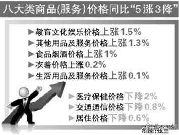 分类别看,CPI八大类商品(服务)价格环比呈“6涨1平1降”态势。其中,教育文化娱乐价格上涨3.1%、食品烟酒价格上涨0.8%、交通通信价格上涨0.8%、生活用品及服务价格上涨0.5%、其他用品及服务价格上涨0.1%、居住价格上涨0.1%;医疗保健价格持平;衣着价格下降0.2%。