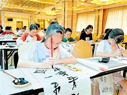 本报讯 (记者何梓瑜 实习生罗娜芬)8月18日下午,梅江区2024年“云香斋杯”中小学生毛笔书法大赛在梅城举行,70多名中小学生参赛挥毫。