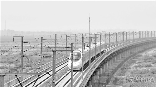 图为进行测试的动车组列车行驶在镇朔湖特大桥上。