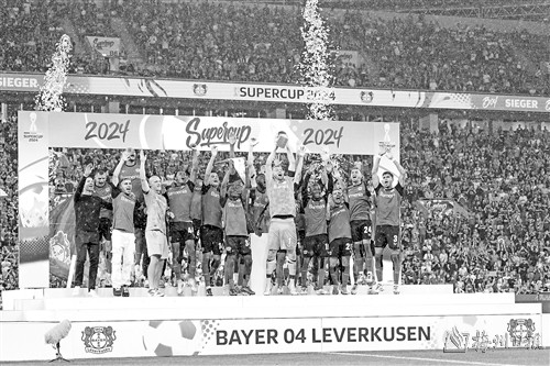 当日,在德国超级杯决赛中,2023-2024赛季德甲与德国杯双料冠军勒沃库森队与德甲亚军斯图加特队在常规比赛时间里战成2比2平。经过点球大战,勒沃库森队最终6比5战胜对手,夺得冠军。(新华社发)