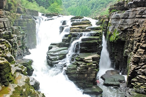 从腾龙洞出来,我们从洞右边穿过山崖,壮观惊险的腾龙洞大瀑布(又叫卧龙吞江)展现在眼前。巨大的清江水流咆哮着冲向地下暗河,让人有一种惊心动魄、神秘莫测的感觉。腾龙瀑布落差并不大,洞口河段阶梯瀑布宽50多米,落差30余米,但清江流入洞口后,洞中的河床依然呈15度至20度的下坡,最后在16公里外的恩施大峡谷底部重见天日。高速的激流发出的水声被天然的 “山洞大音箱” 放大后,轰鸣声令人心跳加快,震撼无比!