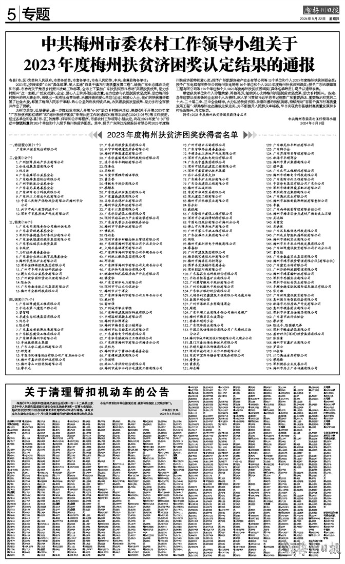 为树立典型,弘扬善举,进一步推动我市深入开展“6·30”助力乡村振兴活动,根据《关于开展2023年度“广东扶贫济困红棉杯”和“梅州扶贫济困奖”申报认定工作的通知》(梅市农农函〔2024〕108号)等文件规定,经过各单位和各县(市、区)的推荐、评审和公示等程序,市委农村工作领导小组决定,向在2023年度“6·30”活动中慷慨解囊的203个单位和个人授予梅州扶贫济困奖。其中,授予广东珠江投资股份有限公司2023年度梅州扶贫济困特别爱心奖;授予广州凯源房地产实业有限公司等12个单位和个人2023年度梅州扶贫济困金奖;授予广东电网有限责任公司梅州供电局等16个单位和个人2023年度梅州扶贫济困银奖;授予广东讯源建筑工程有限公司等174个单位和个人2023年度梅州扶贫济困铜奖(具体名单附后),现予以通报表扬。