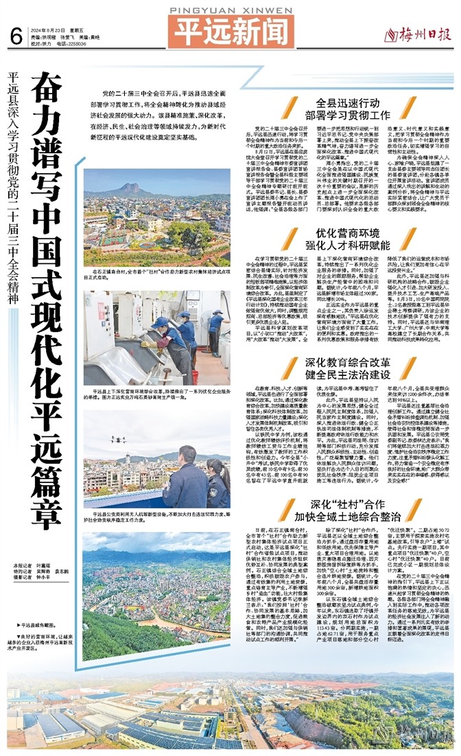 在党的二十届三中全会精神的指引下,平远县上下正以饱满的热情和坚定的决心,迅速兴起学习贯彻全会精神的热潮。各级各部门将全会精神融入到实际工作中,推动各项改革任务的落地见效,为平远县的经济社会发展注入了新的动力。通过一系列扎实有效的举措和显著成果的展现,平远县正朝着全面深化改革的宏伟目标迈进。