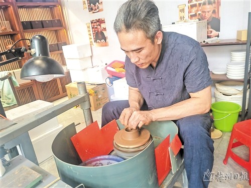 梅县区宪梓大道的一间店铺里,面对通透的落地窗,端坐在工作台前的“嘉应工匠”郑松水丝毫没有受往来行人的打扰,而是一心在工作台前揉泥、拉坯、修坯……一坨泥巴,经他的手慢慢成为一把手拉壶。从年少参军报国的“兵心”,到深耕手拉壶技艺的“匠心”,退役后,郑松水在创新创业“新战场”上勇于发挥“敢打必胜”的精神,不断展现退役军人的风采,被我市评选为“嘉应工匠”(陶瓷类)。
