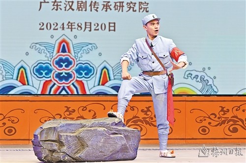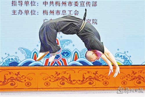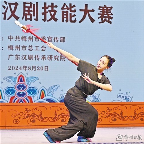 8月20日,梅州市首届广东汉剧技能大赛在“南国牡丹”剧场举行,来自广东汉剧传承研究院的15名演职员登台竞技。飞脚、旋子、抢背、虎跳、前桥、搬腿……参赛选手们炫技能、亮绝活,各展风采。