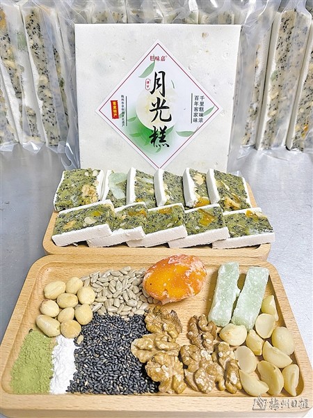 公司主打产品“糕味嘉月光糕”,是公司自主研发的一款颇受市场欢迎的明星产品,年销售额500余万元。月光糕原料是熟糯米粉、瓜条、芝麻、花生、瓜子、橘饼,为了能够被更多人认可,保证每一份材料都是经过严格的精挑细选,产品经过不断尝试改进工艺,口感比以往传统手工制作得更加丰富多样。
