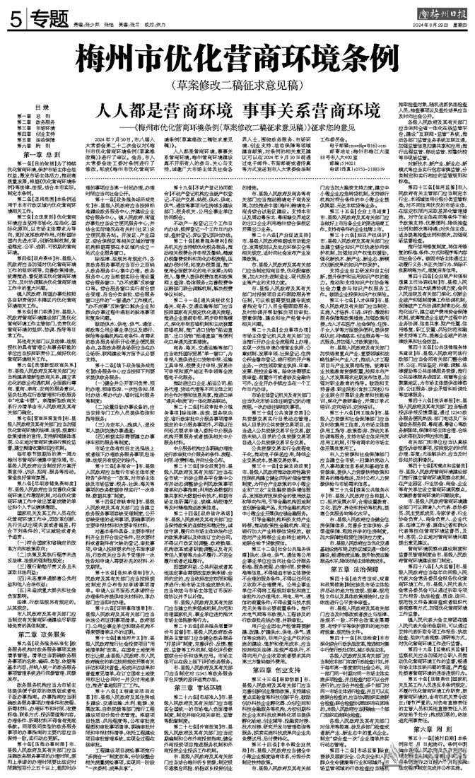 人人都是营商环境,事事关系营商环境,梅州营商环境建设离不开所有人的参与、关心与支持,诚邀广大市场主体及社会各界人士,围绕政务服务、市场环境、创业支持、法治保障等领域建言献策,对条例的相关意见建议可以在2024年9月30日前通过电子邮件、书面邮寄或者传真等方式发送到市人大常委会法制工作委员会。