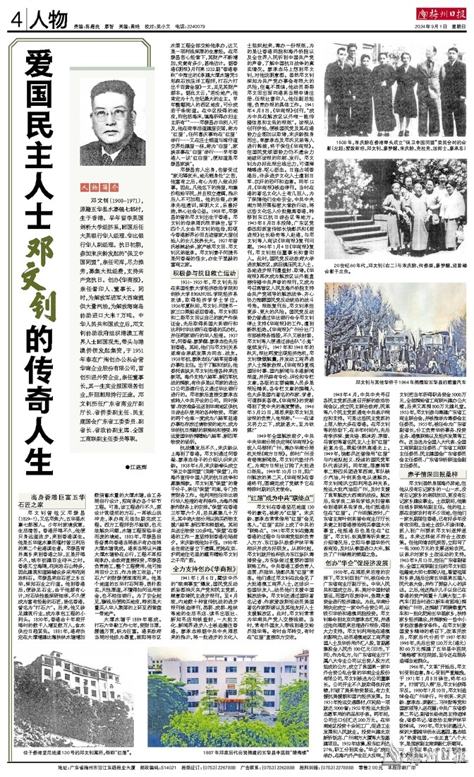 邓文钊(1908-1971),原籍五华县水寨镇七都村,生于香港。早年留学英国剑桥大学经济系,回国后任大英银行华人经理、华比银行华人副经理。抗日初期,参加宋庆龄发起的“保卫中国同盟”,亲任司库,尽力操劳,募集大批经费,支持共产党抗日。创办《华商报》,亲任督印人、董事长。同时,为解放军进军大西南提供大量汽油,为解放海南岛协助进口大米7万吨。中华人民共和国成立后,邓文钊协助政府组织港澳工商界人士回国观光,带头与港澳侨领发起集资,于1951年春在广州创办公私合营华南企业股份有限公司,首创引进外资企业,亲任董事长,其一生实业报国艰苦创业,肝胆相照持行正途。邓文钊历任广东省商业厅副厅长、省侨委副主任、民主建国会广东省工委委员、副省长、省政协副主席、全国工商联副主任委员等职。