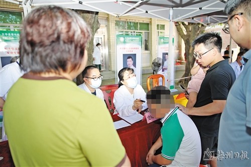本报讯 (记者赖锋 特约记者周扬)“哎呀,太方便啦。家门口就能享受到省级专家坐诊的待遇,非常好”。8月31日,南方医科大学皮肤病医院与五华县慢性病防治站签订“双百行动”结对帮扶合作协议并开展义诊活动。听闻南方医科大学皮肤病医院专家到五华县慢病站开展义诊活动,水寨镇黄井村村民李俊威一大早便来挂号排队。