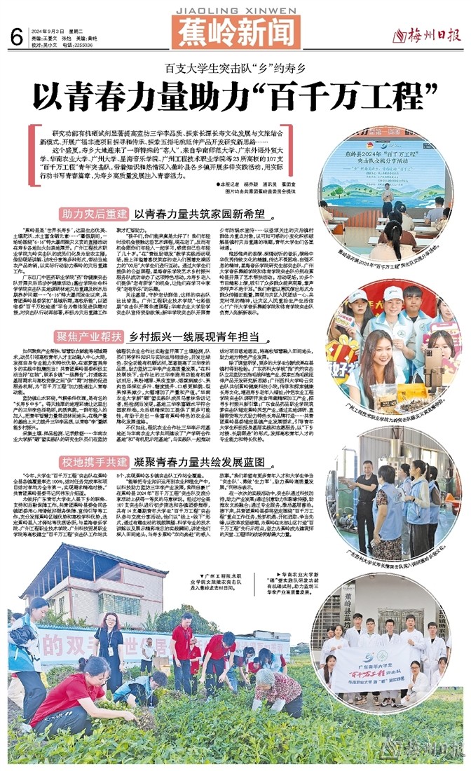 “今年,大学生‘百千万工程’突击队在蕉岭全县各镇覆盖率达100%,结对任务完成率和项目结对率均为全市第一,实现需求精准对接。”共青团蕉岭县委书记何伟东介绍道。