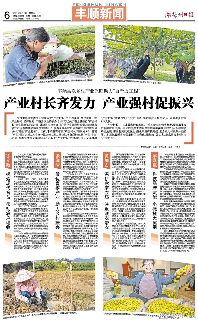 “产业村长”一头连着农村和农民,一头连着市场和消费者,发挥着重要的桥梁纽带作用。他们的主要工作职责包括科学谋划乡村产业、积极推动产业发展、带动村民就地就业、强化产品产销对接、助力壮大村级集体经济等。本报记者近日专程采访了徐奕政、张细清、黄加占、廖嘉臣等丰顺4名“产业村长”。