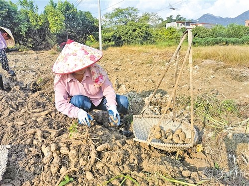 黄加占介绍说,他种植番薯已有20多年,从一开始种植几亩发展到现在的60多亩,已积累了不少种植经验。眼下丰收的番薯品种“白皮紫薯”,就是他经过长期摸索和学习结出的“硕果”,亩产量能达到2000斤至2500斤。“我就住在附近,有空的时候就过来帮一下忙,赚一点补贴家用,一天工资有150块钱。”正在加占家庭农场帮忙的村民黄大哥表示,在家门口就业特别好,可以实现务农、顾家、赚钱“三不误”。
