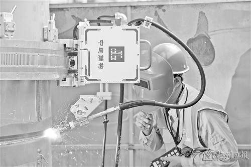 当日,10台智能焊接机器人在深圳湾超级总部基地C塔项目建设现场正式投入使用。本次投用的柔性焊接机器人由中国建筑自行研发,承担项目东塔10根直径2.5米外框钢柱、约7000吨钢构件的现场焊接任务。