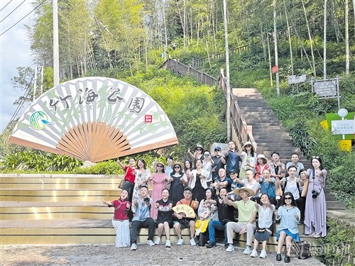 在蕉岭县南磜镇,采风团成员们沿着长约1公里的森林旅游景观栈道,深入竹海公园,沉浸式体验森林氧吧。“走进这里有一种‘曲径通幽处’的美,空气也特别清新。”一名采风团成员盛赞。据了解,除了特色乔木和花卉,竹海公园内还打造了100亩的灵芝、南药等林下种植示范基地,实现经济效益和生态效益双丰收。