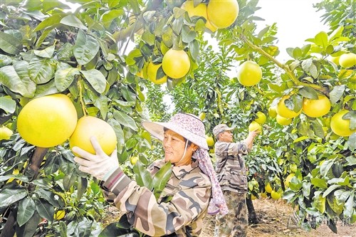 记者在梅州杉富绿色生态农业发展有限公司蜜柚种植基地看到,连绵起伏的山上种满了柚树,淡黄色的柚果压弯了枝头,工人们正在把一筐筐柚果运送到公路旁的转运车上,以便运输到柚仓集中清洗、分拣和包装。