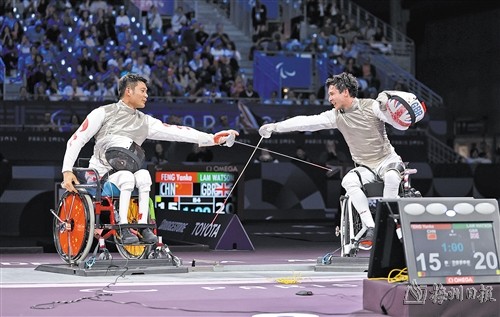 当日,在巴黎残奥会男子花剑团体赛决赛中,中国队45比34战胜英国队,获得冠军。(图片均为新华社发)