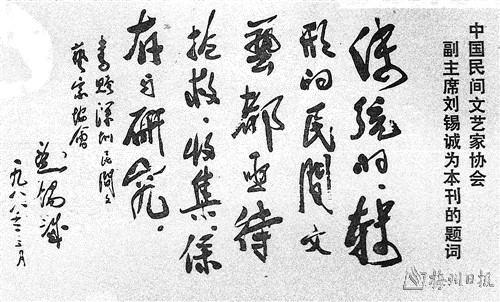 这次会议采取理论研讨与现场调研相结合,先后在珠海、深圳两个经济特区召开理论研讨、内地与港澳民间文艺家座谈,并到改革开放的民间文化“现场”考察。在深圳会议期间,我受市文联、市民协领导的委托,具体负责接待与安排考察座谈活动,同时还提交了《试论深圳新民俗文化——兼论中国民间文化(文学)的现代化发展方向》一文,在大会宣讲交流。考察过程中,我留意到,刘锡诚先生总是以满腔热情看待经济特区民间文化发生的新事物,并且带着问题在调研和思考。这次会议结束后,由刘锡诚先生主编的《民间文学论坛》刊载了包括拙文在内的相关文章。刘锡诚先生指出:“大家对特区正在发展变化的民间文化很感兴趣。目前,民间文化(文学)界面临两个问题,一是传统民间文化如何挖掘保护和传播,二是民间文化如何随着经济的发展而发生变化。第一个是民族传统文化的命运问题,目前全世界对此极为关心,特别是工业化的国家更为关注;第二个是民族传统文化发展变化的问题,目前我国不少地方,已出现民族文化中西融合的倾向。”他在给《深圳民间文艺》题词时也指出:“传统的、转型的民间文艺都亟待抢救、收集、保存与研究。”(见《深圳民间文艺》1988年第2期)锡诚先生主张应该抢救、收集、保存与研究“传统的、转型的民间文艺”,实则是提出了新时期如何继承、创新发展中国民间文化(文学)的重要命题。