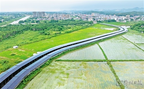 在兴宁市新圩镇船添村,两排光伏电板犹如两条蜿蜒的巨龙,并排在田间,周边连片的禾苗绿满田畴、长势喜人(如上图,连志城摄)。这条光伏长廊通过农光互补方式,让光伏发电与农业种植相互融合,构成了一幅美丽画卷。