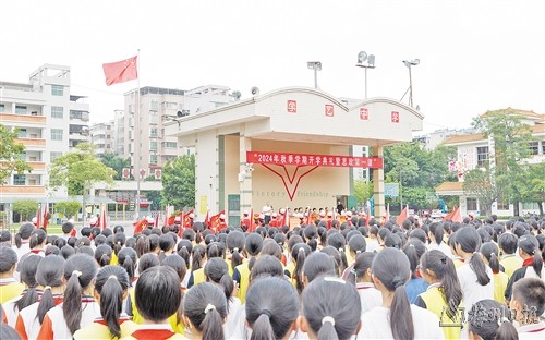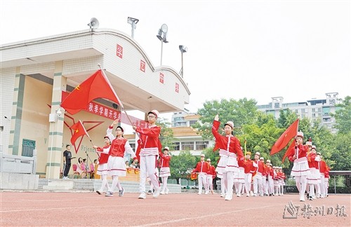 9月2日,梅州市学艺中学以“2024年秋季学期开学典礼暨思政第一课”拉开了新学期序幕。该校党总支部书记邱伟炎为全体师生作《争做强国有我好少年》主题思政第一课,图为该校鼓号队在进行队列表演。