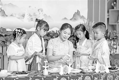 9月8日,在江苏省兴化市文林幼儿园,小朋友在老师的指导下学习做月饼。