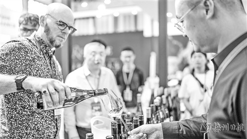 9月9日,参展商在酒博会现场品酒。