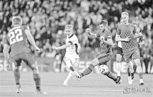9月10日,英格兰队球员戈登(左二)在比赛中射门。