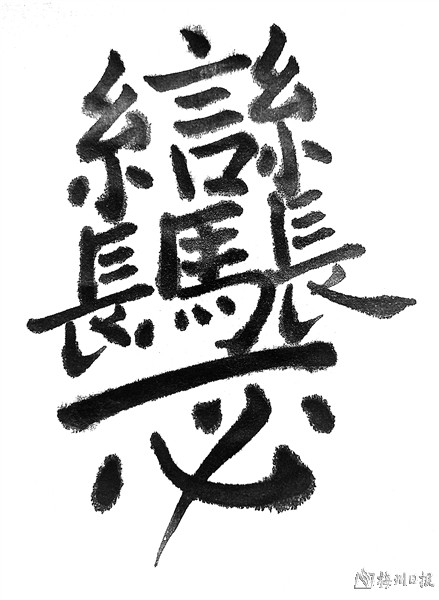 翣:客家另有一个与翣字同音同义的自造字。先说翣的读音和意义。《石窟一征》:“卓(桌)垫谓之卓(桌)翣。按《尧山堂外纪》:太祖尝微行入酒坊,遇一监生,与之对席,帝因举翣几小木,命生赋诗,应曰:‘寸木元从斧削成,每于低处立功名。他时若得台端用,要向人间治不平。’帝喜。翌日,召生,命为按察司。翣字,作垫字用,见此。” 翣(shà),小扇。在《石窟一征》中,翣读“西压切”,义同垫。桌垫,垫在桌脚底下,使桌面平衡的小木块。客家人自造了一个与翣字同音同义的方言字(如上图)。分解这个方言字的口诀是:一点一横杠,二字口来装(言),两边纽丝子(“言”字左右两边一边一个“糸(mì)”字)。中间马占房(即繁体的“马”字)。左也长、右也长(“马”字左、右两边各有一个繁体的“长”字),一必到龙王(“一”字和“必”字)。这个方言字共51画,上、中、下结构,由一个“言”、两个“糸”、一个“马”、两个“长”、一个“一”、一个“必”八个单字组成。这八个单字中最有象征意义是“一”字,它表示桌垫的形状。没有这个“一”字,桌垫的意义就失去了。
