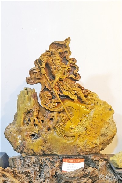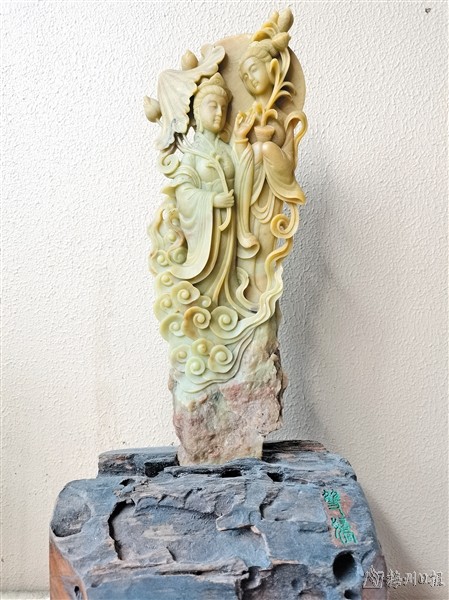 据了解,我市艺术家蒋向华和徐璆芳的作品,均取材梅州本地叶蜡石。蒋向华的石雕作品《悟空》,展现的是孙悟空手执金箍棒,从石头中驾云腾起,寓意石破天惊,每个人心中都有一个悟空。徐璆芳的石雕作品《双娇》,选用细腻的美石,雕刻出手持莲花、珠联璧合的柔美双姝,寓意出淤泥而不染,濯清涟而不妖。