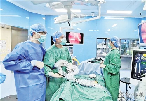 阿宝在出生后多次出现肺部感染,经过医院严格的术前评估,出生6个月后,身体各项指标符合手术要求,于是小儿外科副主任邓富强手术团队为患儿实施胸腔镜隔离肺切除术(如右图),在婴儿狭小的胸腔内置入2枚3毫米的操作钳进行手术操作,手术难度大,要求医生操作必须非常精细,历时1个多小时,手术顺利完成。