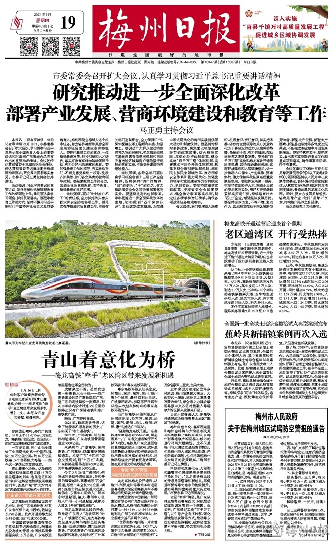 9月16日,新华社客户端播发新华每日电讯记者采写的《青山着意化为桥——梅龙高铁“牵手”老区湾区带来发展新机遇》一文。本报今日全文转载,敬请垂注。