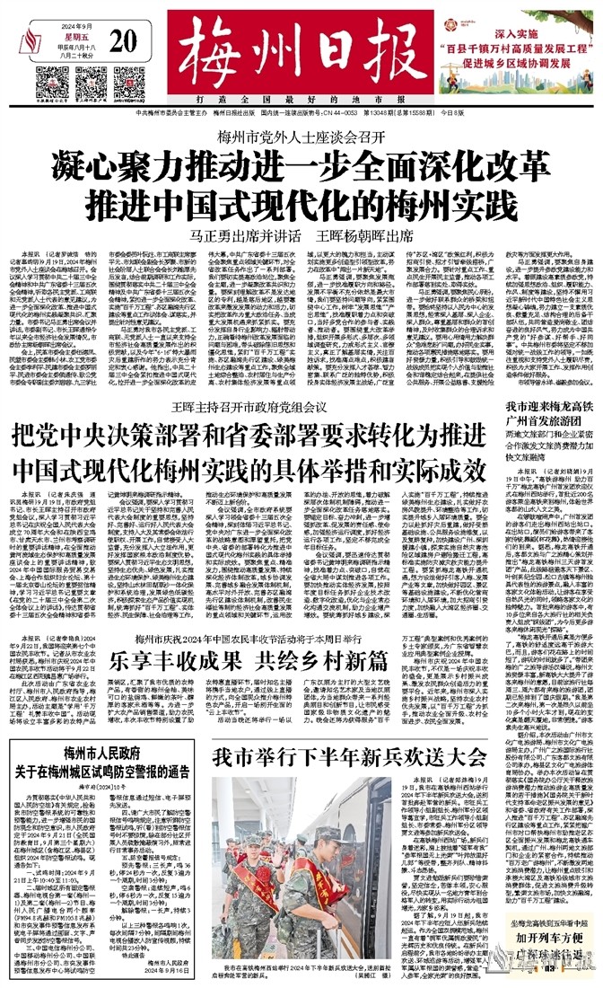 会议强调,要迅速传达贯彻省委书记黄坤明来梅调研指示精神,找准着力点、突破口,自觉在全省大局中谋划推进各项工作。要加快推动实体经济发展,按照年度目标任务抓好企业技术改造、数字化改造,优化与企业常态化沟通交流机制,助力企业增产增效。要统筹抓好城乡建设,深入实施“百千万工程”,持续推进绿美梅州生态建设,扎实做好农房风貌提升、环境整治等工作,切实提升城乡人居环境质量。要全力以赴抓好灾后重建,做好受损基础设施、公共服务设施修复,以及复耕复种,加快建设广州、深圳援建小镇,探索实施自然灾害危险区域建房户避险搬迁工程,高标准实施防灾减灾救灾能力提升工程。要紧抓梅龙高铁开通机遇,想方设法做好引客入梅、发展产业等文章,加快做好园区、景区等基础设施建设,不断优化营商环境和人居环境,加大招商引资力度,加快融入大湾区经济圈、交通圈、生活圈。