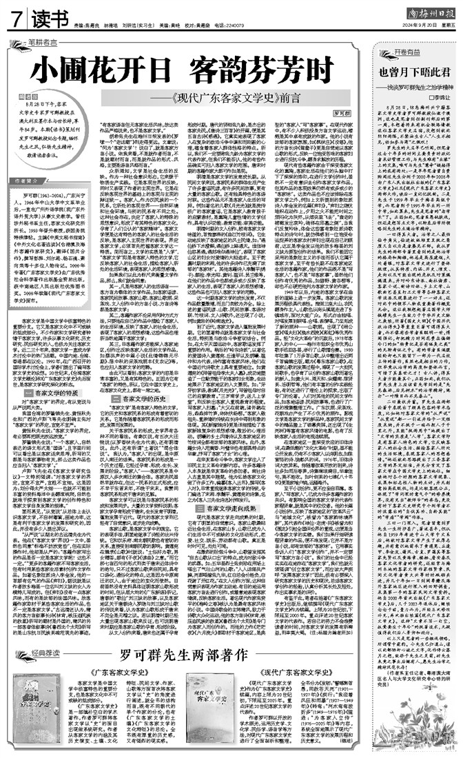 有鉴于此,笔者在拙著《广东客家文学史》出版后,继续撰写《现代广东客家文学史》作为续篇。上限为20世纪初,下限延至2005年。重点评述20世纪客家文学的代表作。若自己的努力不会浪费读者的时间,对客家文学的发展有所裨益,则幸莫大焉。(注:标题为编者所加)