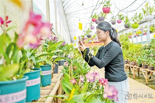 近日,一名游客在龙陵县石斛花卉交易展示中心拍摄石斛花。