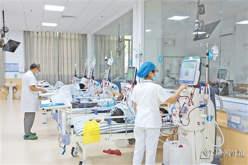 走进中山大学附属第三医院粤东医院广梅开发区医院(以下简称“广梅开发区医院”)血液净化中心,记者看到宽敞洁净的治疗区域内,整齐摆放着血液净化机床等各种医疗设备,患者们正在接受治疗。“以前我每周要去梅城透析两次,坐公交车也挺折腾的,自从这里有了血液净化中心,很方便。”患者张先生说,想不到乡镇卫生院的设备也越来越先进,而且每周都有专家来坐诊,让群众在“小地方”解决“大问题”。