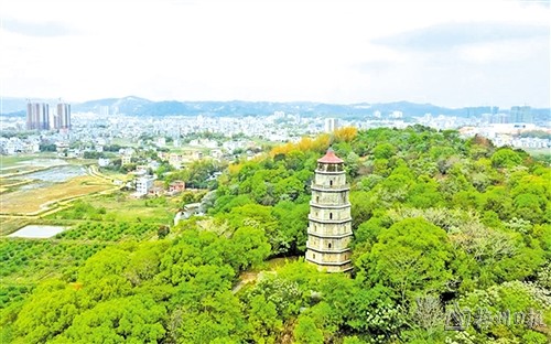 狮雄山上还有一座山塔,登上塔顶,放眼望去,群峰叠翠,天地辽阔,令人心旷神怡。从狮雄山上下来,回望狮雄山,狮雄山遗址已成为五华县的重要名片,“长乐文化”“长乐精神”早已深深镌刻在五华人的骨子里。(汤权)
