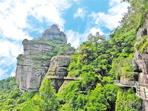 走出峡谷,我们继续沿着人工铺设在半山悬崖峭壁上的栈道,依次经过“仙人跪膝”“横岩傲雾”等景观。然后,艰难地向近似天梯的“吊谷上棚”攀登。爬500多级石阶是辛苦的,但我们并没有被深入云端的石阶吓倒,反而十分乐意“享受”些许攀援之累。来到“天门”时,已大汗淋漓,衣衫湿透。