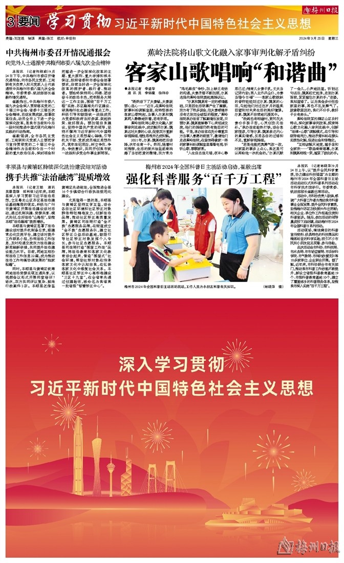 蕉岭法院紧扣辖区山区农村特点,深化家事审判改革,探索将山歌文化融入审判实践中,创新“法律+山歌”调解模式,在引导和疏导端用力,推动矛盾纠纷在源头实质性化解,促进社会和谐稳定。