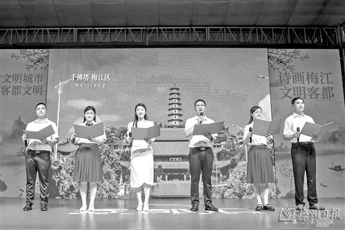 喜迎祖国华诞,追寻红色记忆,传承苏区精神,展现梅江风貌。9月21日晚,由梅州市梅江区文学艺术界联合会、南方电网广东梅州供电局主办,梅州市梅江区作家协会、江南街道红光社区承办的“诗歌里的中华情”——庆祝中华人民共和国成立75周年诗歌音乐会在梅城客都汇户外广场隆重上演。诗歌音乐会以朗诵、歌舞以及乐器演奏等形式献礼祖国华诞。晚会格调优雅大气,节目精彩纷呈,现场气氛热烈。除了现场嘉宾、演出人员、梅江区作家协会会员以及家属之外,也吸引了周边群众驻足观看。