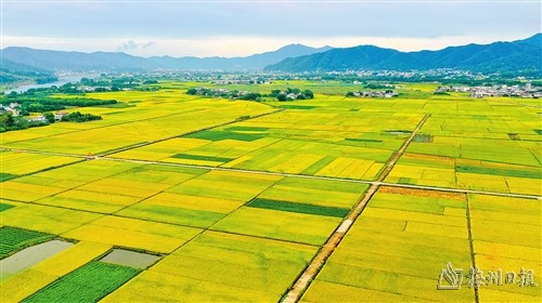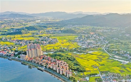 蕉城周边稻田与现代建筑同框,呈现出“都市田园”美景。(汪敬淼 摄)