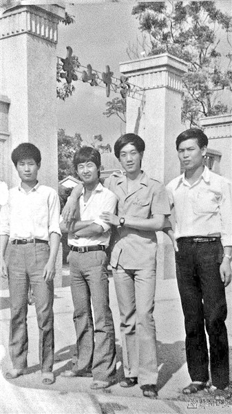 高一的班主任是彭建新老师,当时他是韩山师专毕业不久的青年教师,教学积极性很高,写得一手漂亮的粉笔字。他打扮时髦,性格随和,玉树临风,风流倜傥,很快跟同学们打成一片,甚至称兄道弟。经过一段时间之后,他同意班长由同学们民主选举产生,我就是当时的幸运儿。有一次,他给我们命题作文,允许虚构人物情节。虽然我不是很同意这种写法,但我还是很佩服老师思路的开阔和创新。往后的很多作文,我经常受到老师的表扬和堂读。再接着,轮到我们班出版学校的黑板报,也就非我莫属了,当然还有王建侨等同学的通力合作,每一期的出版质量都是排列学校前茅的。彭老师当时常穿的猎装和牛仔裤都是那个年代的时尚,他跟黄启翼老师、吴少彬老师在老校门的青春留影,仿佛贴上了时代标签。后来,彭老师调往榕城学校工作,有一段时间担任华侨中学副校长,现是榕城区教育局的办公室负责人。王建侨同学也成为东山中学的教导主任。