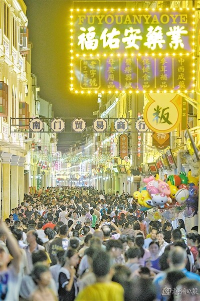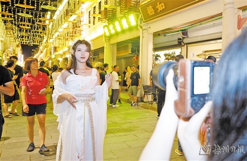 在街区内,头戴配饰、身穿汉服的年轻姑娘时不时在人群中出现。“我们在网上看了不少旅游的帖子推荐来古城‘打卡’汉服拍照,汉服之美,与古城的韵味相得益彰,出片率很高。”广东梅州职业技术学院学生郭晓丽与同伴在朋友圈分享了在古城游玩的喜悦,评论中满是好友们的好奇和向往。“很推荐大家来,在这样美丽的夜色中寻觅着不一样的文化体验与休闲乐趣。”郭晓丽说。