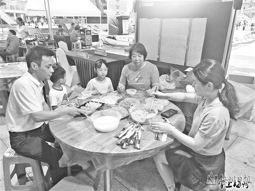 在令人无比期待的百桌菩米宴中,市民游客欢聚一堂,以五华菩米为主要原材料制作的各式美食让游客们大饱口福、纷纷点赞,现场无比热闹,为各地来五华游客带来了一场别开生面的五华菩米美食大宴。“没想到小小的一粒米还可以做出这么多美食,菩米粥尤其好吃。”潮汕球迷李兵买了6张球票、获赠一张菩米套餐消费券,品尝美味菩米宴后,他说准备买些五华菩米回去,带给亲朋好友品尝。
