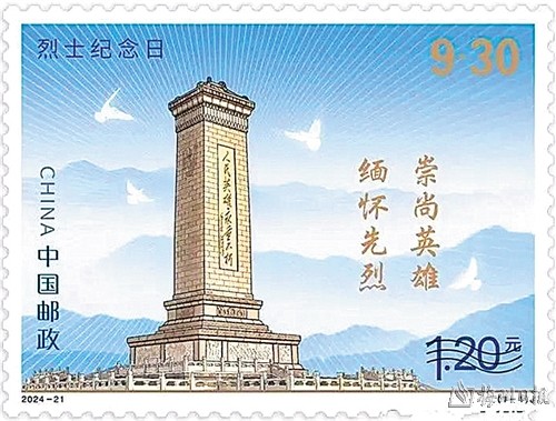 “烈士纪念日,丰碑立方寸”。矗立在首都北京天安门广场的人民英雄纪念碑,是近代以来中国人民和中华民族争取民族独立解放、人民自由幸福和国家繁荣富强精神的象征,是国家和人民纪念、缅怀英雄烈士的永久性纪念设施。今年9月30日是中国第11个烈士纪念日,中国邮政将发行《烈士纪念日》纪念邮票一套1枚(图①),邮票以蓝天下的人民英雄纪念碑为主体,衬以群山,邮票右侧的“崇尚英雄 缅怀先烈”表现烈士纪念日的主题,上方书写“烈士纪念日”与“9·30”展现人民英雄永存天地之间。